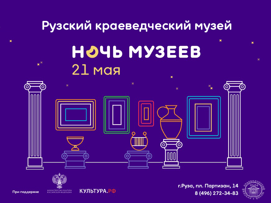 21 мая Рузский краеведческий музей открыт до 23.00. Мастер-классы платные. Экскурсия состоится при наборе от 10 человек. На мастер-классы и экскурсию по городу записывайтесь заранее по телефону 8 (496) 272-34-83.