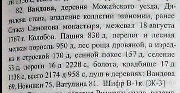Первые картографические упоминания о деревне встречаются в Планах генерального межевания(ПГМ) за 1767 год: «Вандова – деревня Можайского уезда Дягилева стана, владеши коллегии экономии, ранее «Спаса Симонова» монастыря; межевал 18 августа 1767 года Колобов. Пашня 830 десятин, перелог и лесная поросль 950 десятин, лес, роща, дровяной и строевой лес 170 десятин, сенной покос 157 десятин, 33 дома, дороги 16 десятин, болото, кладбище 17 десятин, 69 душ. Основное занятие жителей – земледелие (рожь, овёс).