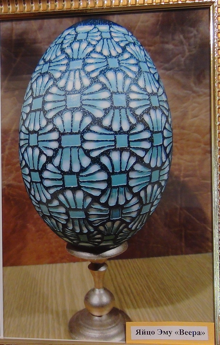 На этой выставке представлено много новых интересных работ мастера. Но особенно удивляют черные яйца страусов с трехцветным орнаментом.
