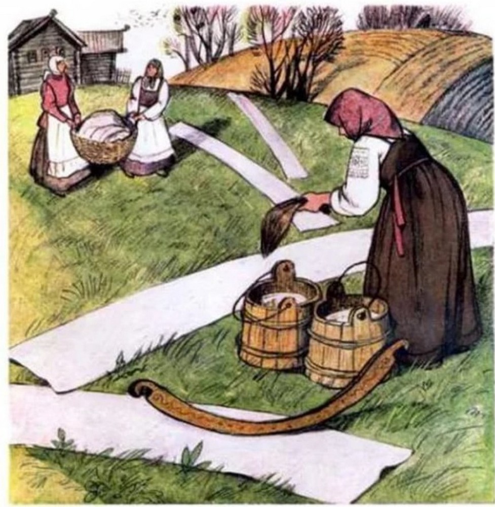Льняная ткань была разного качества: потоньше  - на платье, погрубее - на рабочую одежду. Самим трудоёмким процессом было получение белого  холста. Полотно изо льна имеет серебристо - серый цвет и его надо было весной отбелить с помощью золы. Подходила не любая зола, а только из  ольхи.  А летом материал неоднократно мочили в реке и сушили на солнце,  в результате материал получался такой белизны, что  расстеленный  на снегу,  он едва был отличим.
