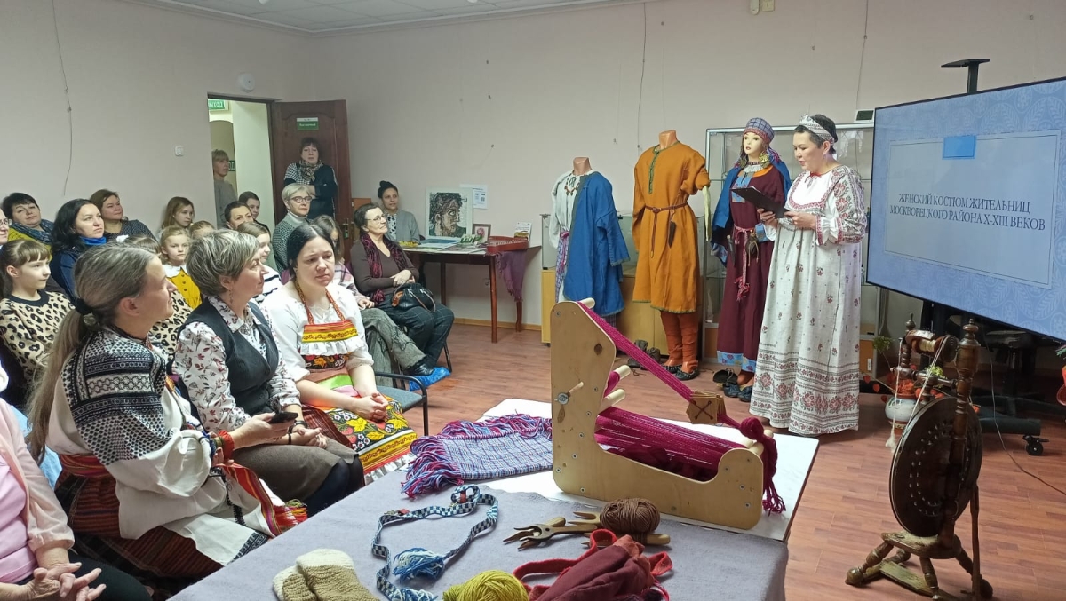 Мероприятие началось с интерактивной программы «Образ средневековой ружанки». Участница клуба исторической реконструкции «Каролинг» и руководитель школьного музея Марина Владимировна Агафонова рассказала об археологических находках элементов женской одежды на территории Подмосковья, а также о том, как ткали и красили ткани на Руси в средневековье.