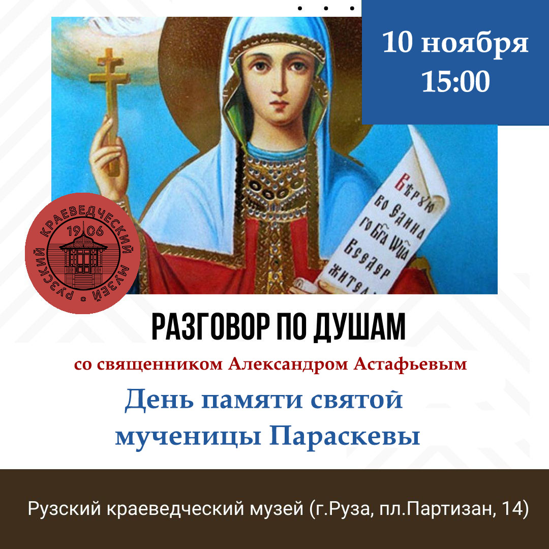 Встреча будет посвящена Дню памяти святой мученицы Параскевы и роли женщины в Церкви. Православные называют этот праздник днем Прасковьи или Параскевы Пятницы или Прасковьи Льнянинцы.