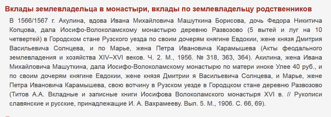 Акилина, жена Ивана Михайловича Машуткина, дала Иосифо-Волоколамскому монастырю по матери иноке Улее 40 руб., и по своим дочерям княгине Евдокии, жене князя Дмитрии я Васильевича Солнцева, и Марье, жене Петра Ивановича Карамышева, свою вотчину в Рузском уезде в Городцком стане деревню Развозово (Титов А.А. Вкладные и записные книги Иосифова Волоколамского монастыря XVI в. // Рукописи славянские и русские, принадлежащие И. А. Вахрамееву. Вып. 5. М., 1906. С. 66, 69).