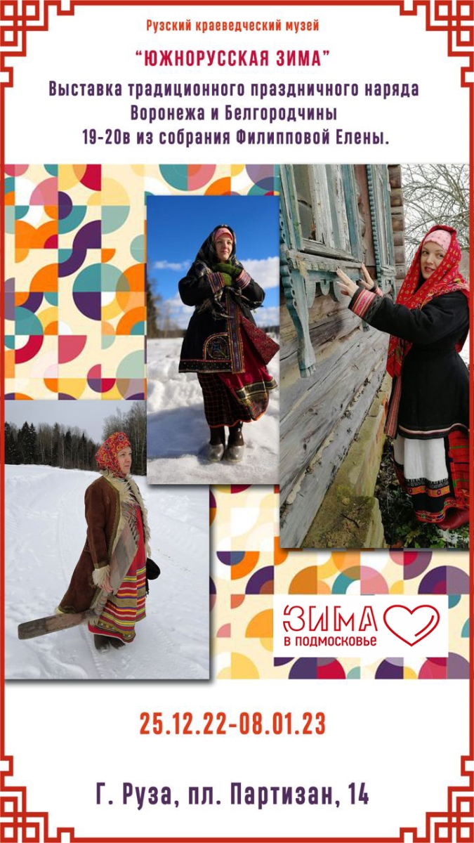 Летом в Рузском краеведческом музее проходила выставка традиционной крестьянской одежды юга России из частной коллекции Елены Филипповой. Как и обещала, к новогодним праздникам Елена привезла в музей свои зимние наряды XIX-XX веков из Курской, Воронежской и Белгородской областей. Их можно увидеть до 7 января на выставке «Южнорусская зима».