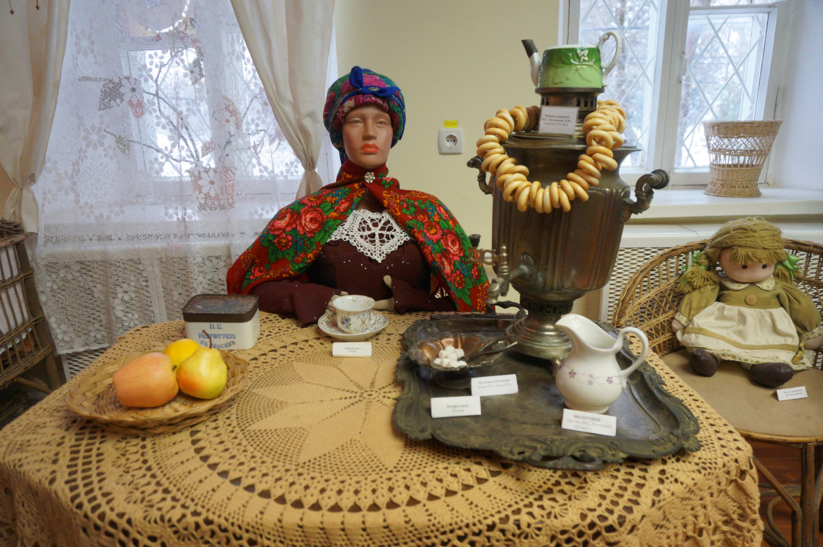 Если речь заходит о купцах, невольно вспоминаешь кустодиевскую купчиху за чаем. И, конечно же, никакое чаепитие не обходилось без самовара, один из которых представлен на выставке. Чай, как «повсеместно употребляемый и желанный напиток», стал таковым не сразу, а только лишь в конце ХVII века. Долгое время чай оставался «городским напитком», причем, преимущественно московским. Даже в Петербург, где был открыт только один специализированный магазин, чай привозили из Москвы, где их было уже около ста. Чуть позднее было налажено производство специальных чайников для заварки, а через столетие после ввоза чая появился и первый на Руси самовар. Само слово «самовар» не имеет аналогов в других языках, оно заимствовано из русского языка. Кипяток, заваренный в нем, действительно получался вкуснее, а заваренный на его «верхушке» чай лучше распаривался.