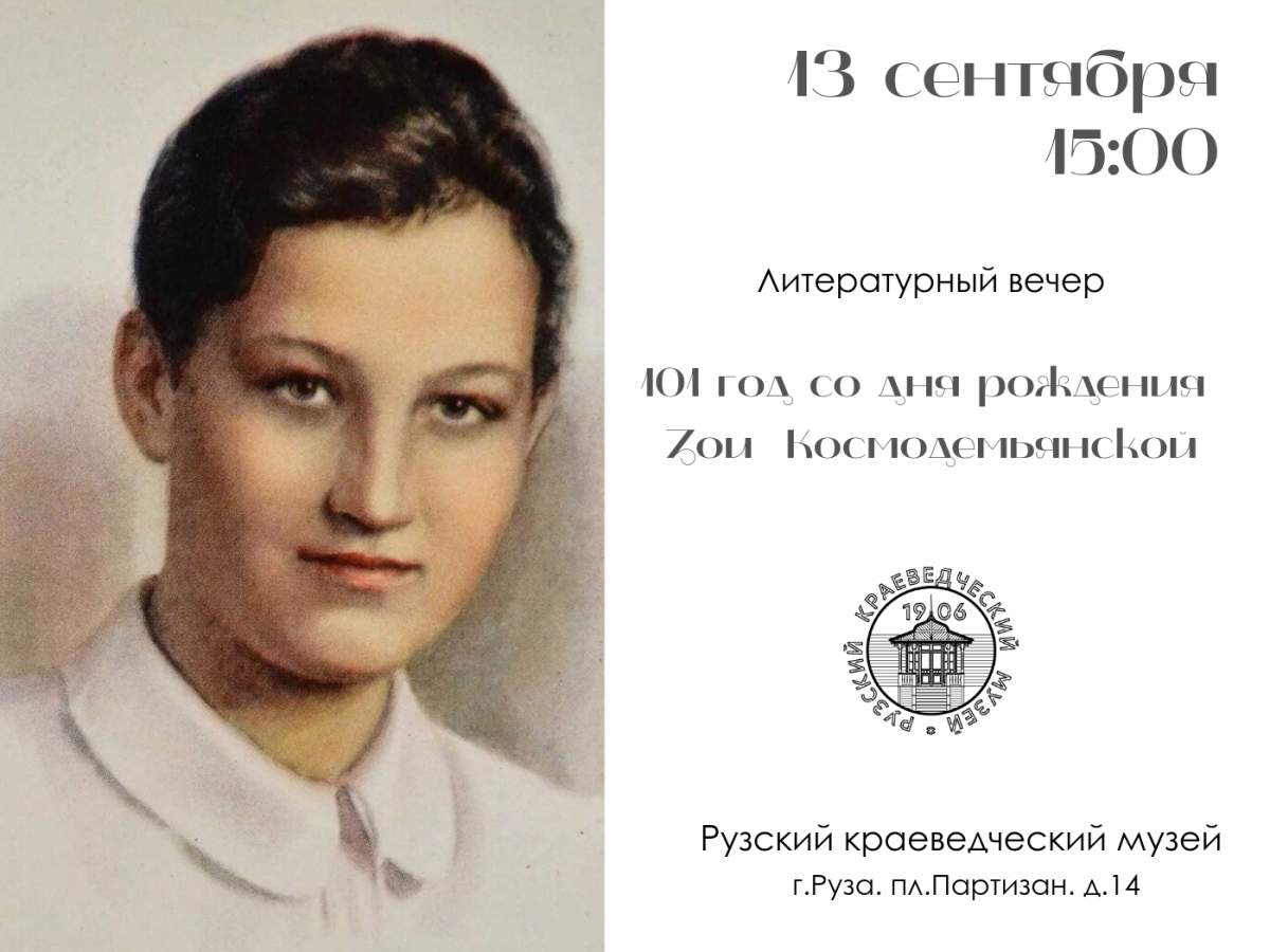 13 сентября в Рузском краеведческом музее состоится литературный вечер, посвященный 101-й годовщине со дня рождения Героя Советского Союза Зои Анатольевны Космодемьянской.