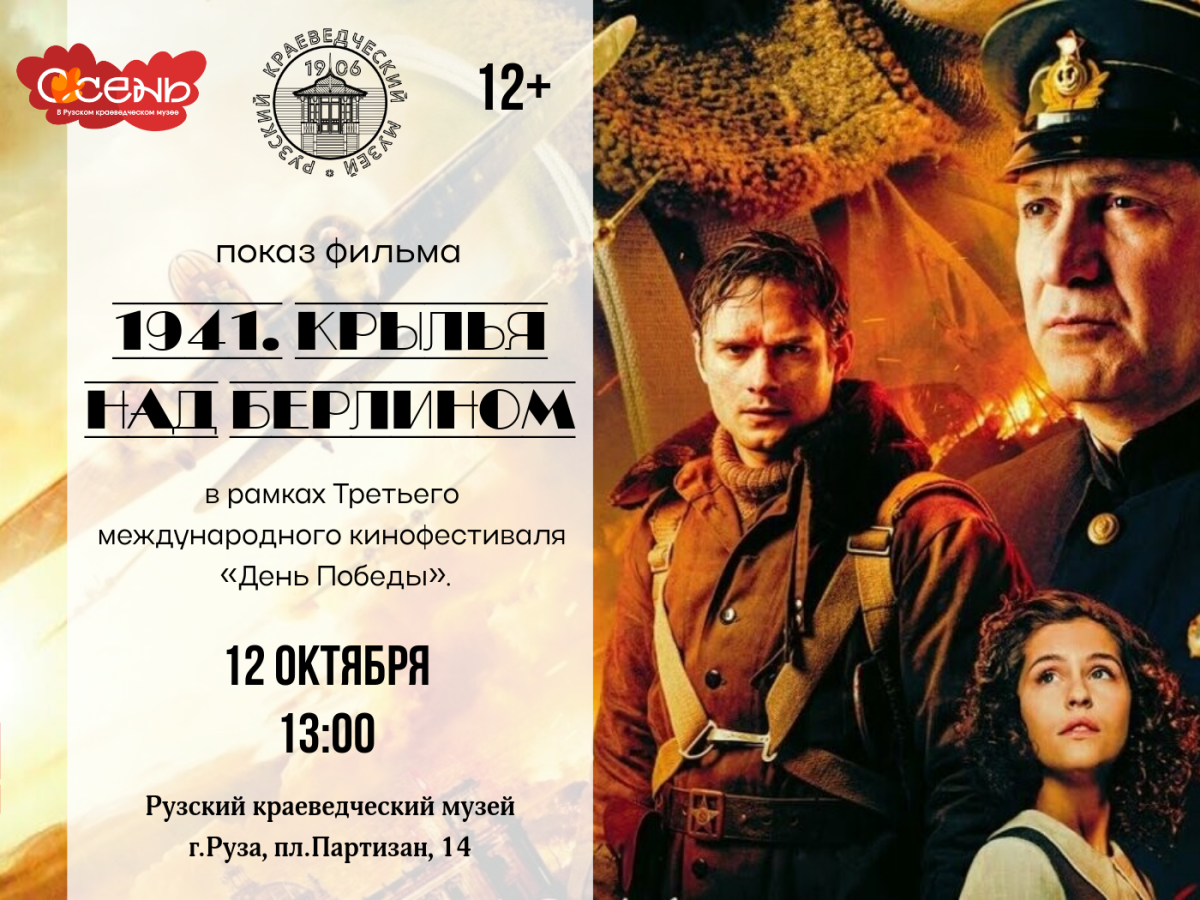 12 октября в 13:00 в Рузском краеведческом музее состоится показ фильма «1941. Крылья над Берлином» в рамках Третьего международного кинофестиваля «День Победы».
