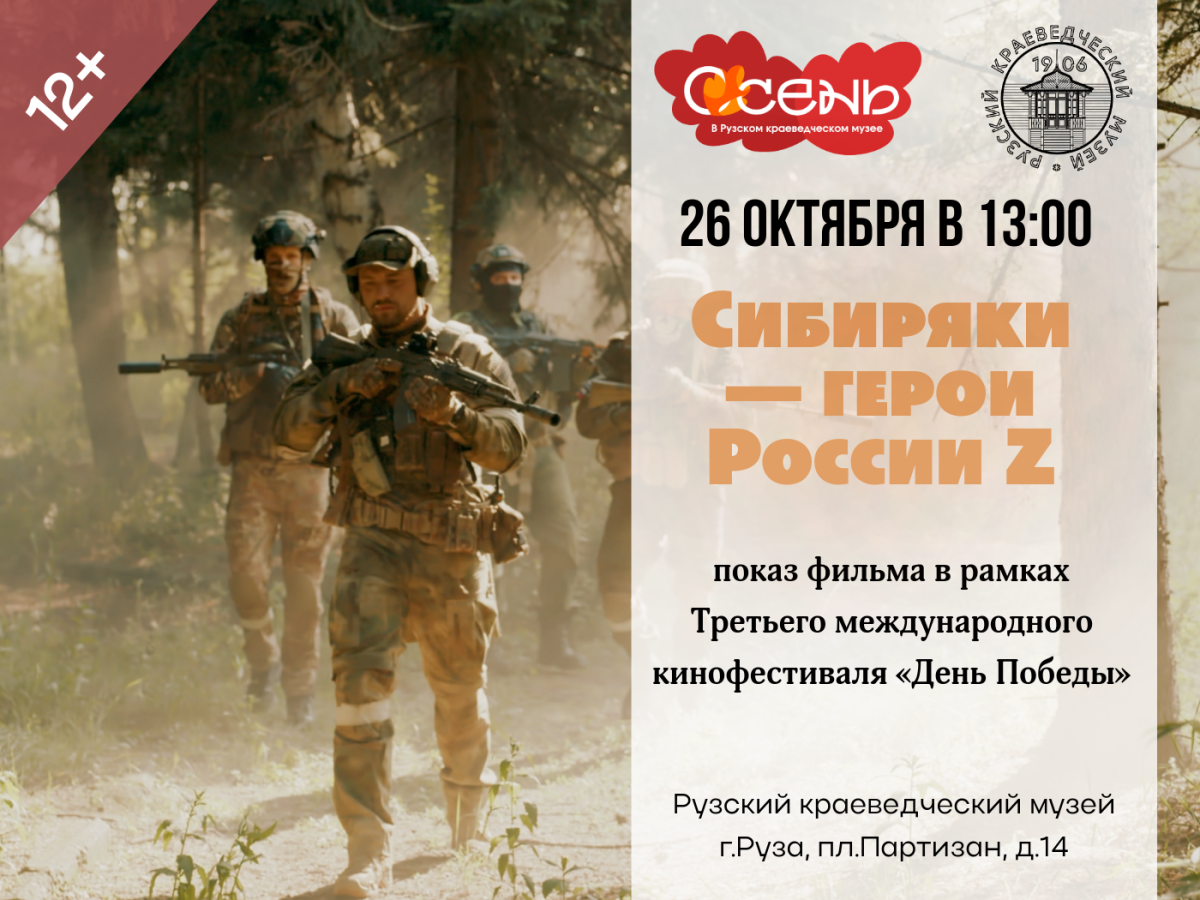 26 октября в 13:00 в Рузском краеведческом музее состоится показ фильма «Сибиряки — герои России Z» в рамках Третьего международного кинофестиваля «День Победы».