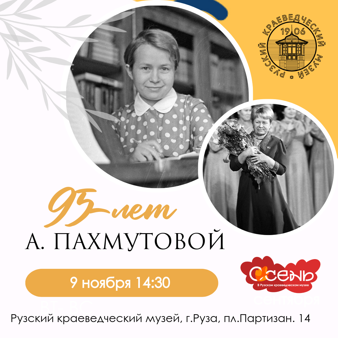9 ноября 14:30 Рузский краеведческий музей приглашает на вечер, посвященный 95-летию народной артистки СССР, композитору, пианистки Александры Николаевны Пахмутовой.