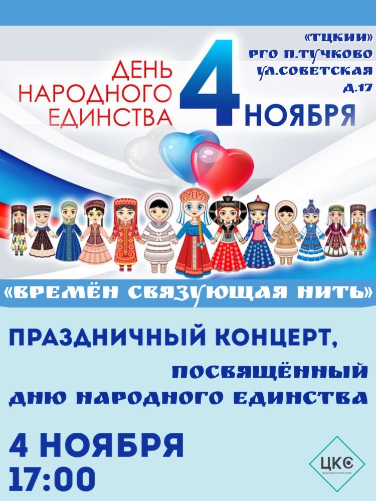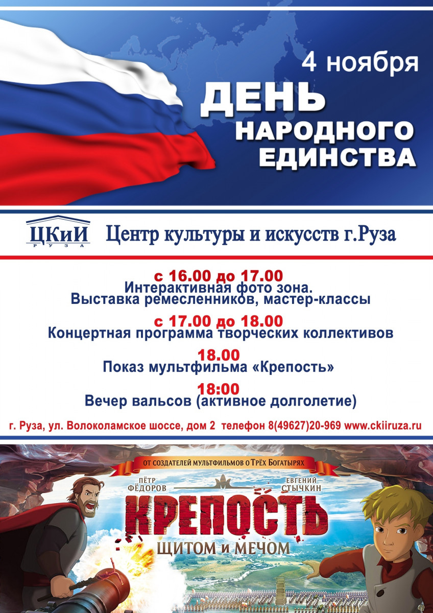 В понедельник, 4 ноября, россияне отмечают государственный праздник – День народного единства. В домах культуры Рузы и Тучково в этот день пройдут праздничные мероприятия. В ЦКиИ Тучково концерт начнется в 17.00, а в ЦКиИ Рузы – с 16.00.