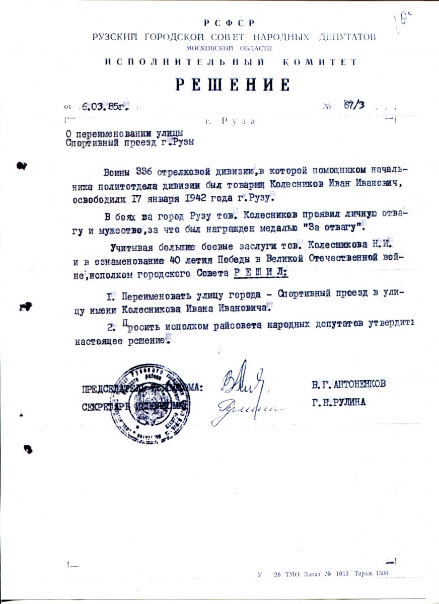 6 марта 1985 года, в честь 40-летия Победы в Великой Отечественной войне решением исполкома Рузского городского совета народных депутатов СПОРТИВНЫЙ проезд г.Рузы был переименован в улицу КОЛЕСНИКОВА.