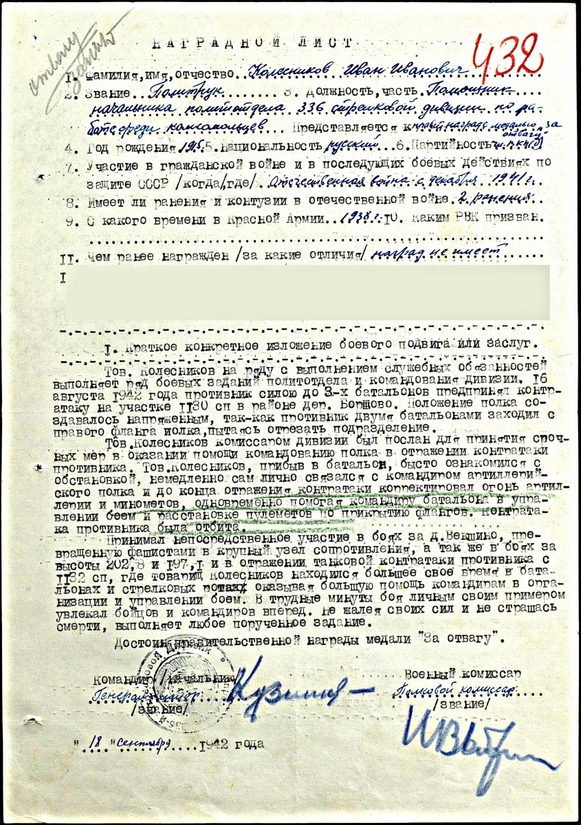 наградной лист (ЦАМО ф. 33 оп. 682524 д. 960 л. 432 с об.)
