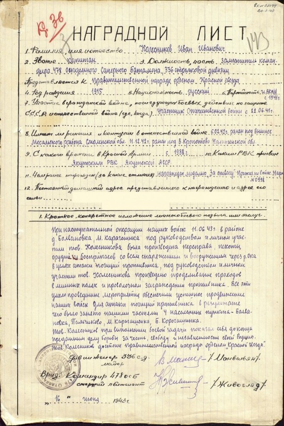 Наградной лист (ЦАМО ф. 33 оп. 682524 д. 359 л. 256 с об.)