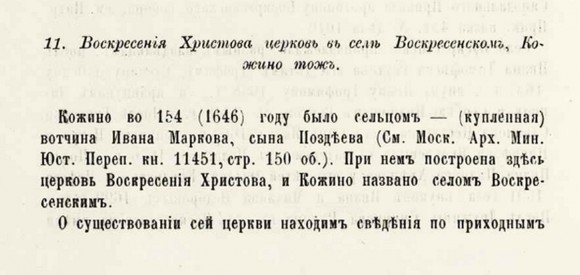 Однако история этих мест восходит к XVII веку. В 1646 году село Кожино в Фоминском стане Рузского уезда было куплено и стало вотчиной Ивана Маркова, сына Поздеева. При нём построена деревянная церковь Воскресения Христова, и Кожино стали назвали селом Воскресенским.