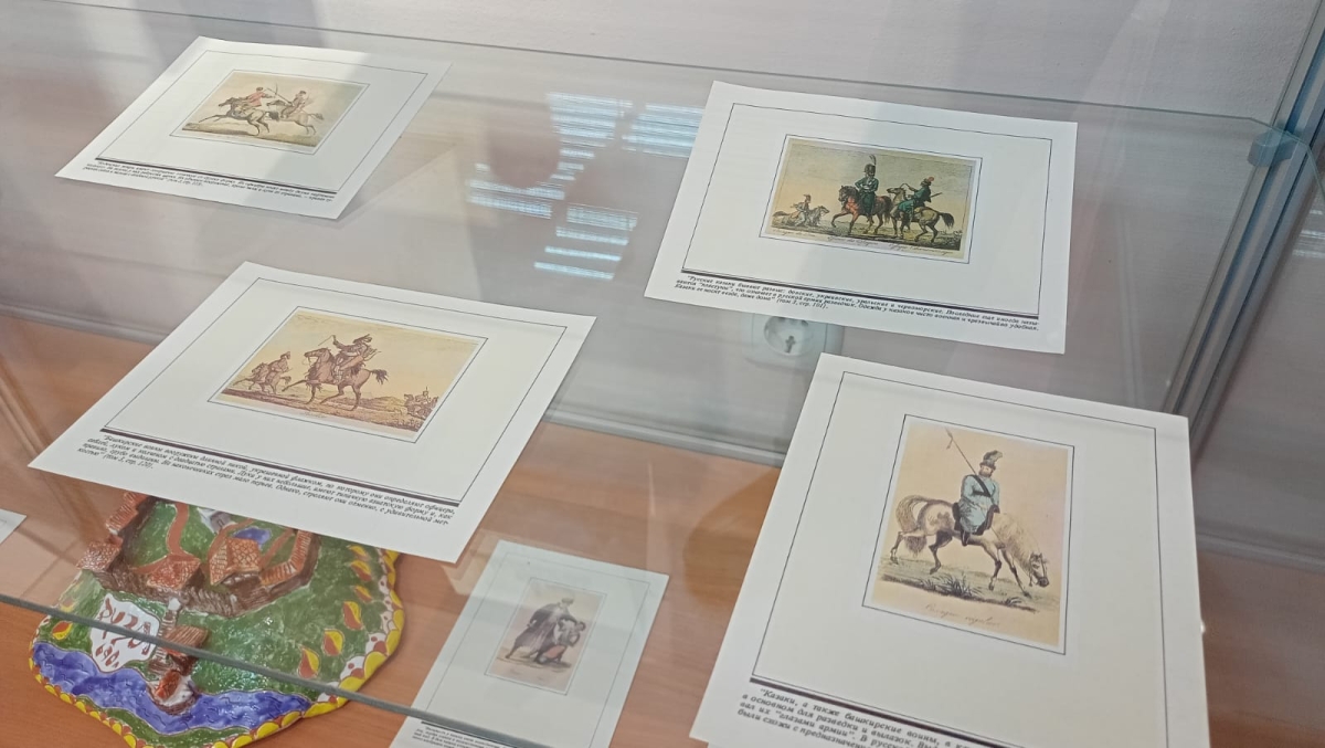 Основную часть экспозиции составили открытки с изображением воинов, выполненные по оригиналам рисунков из редчайшей 6-томной книги «Россия, или нравы, обычаи и костюмы жителей всех провинций этой империи», которая была издана в 1813 году в Париже. Автор-составитель – французский писатель Жан-Батист Бретон.
