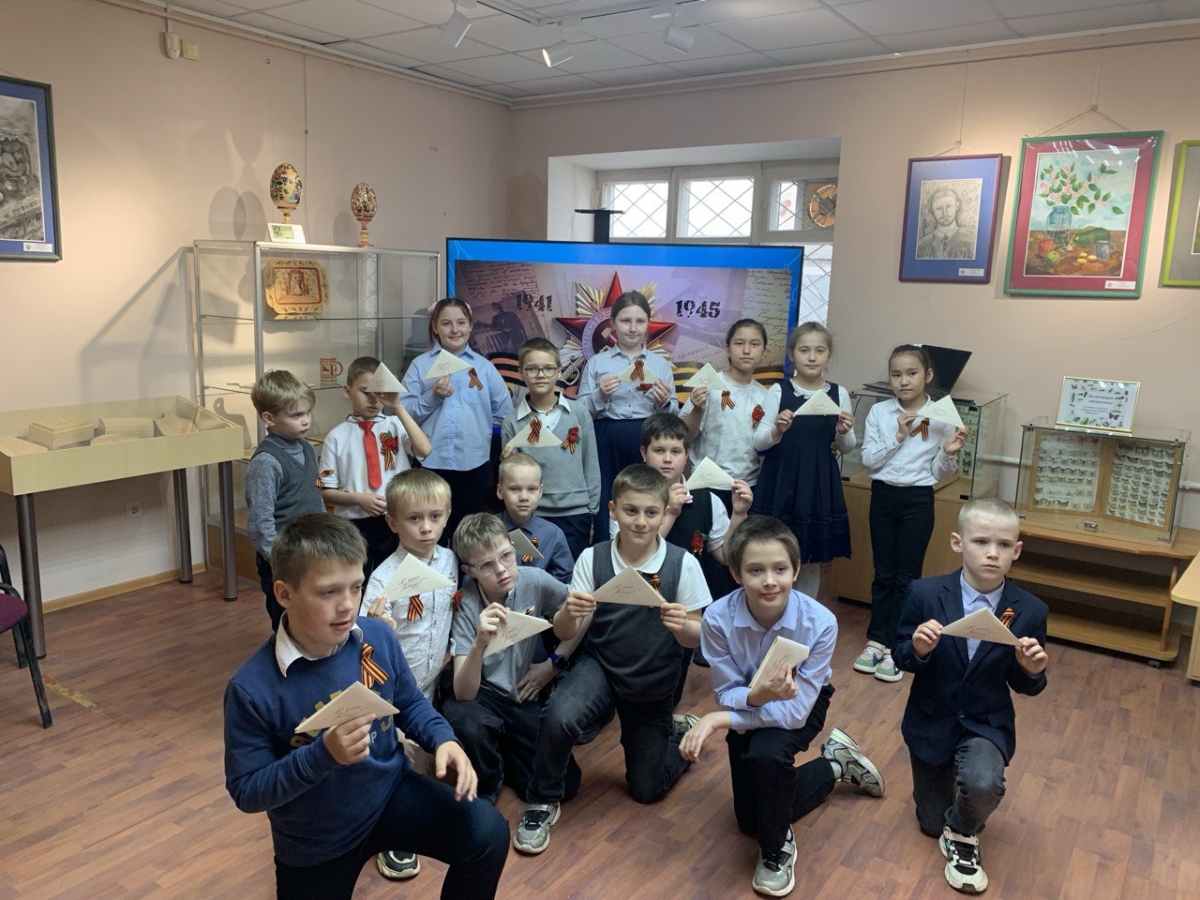 Ребята услышали рассказ о Великой Отечественной войне, посмотрели интересную презентацию, побывали на экскурсии в зале Воинской славы, а также научились складывать письма-треугольники.