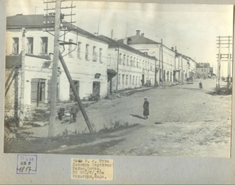 Руза, пл.Партизан, 1949 г. Слева направо располагаются здания: №1 -хозяйственный магазин; №3 - Райзо, Почта; №4 - РК ВКП(б);  Дом культуры; Кафе.