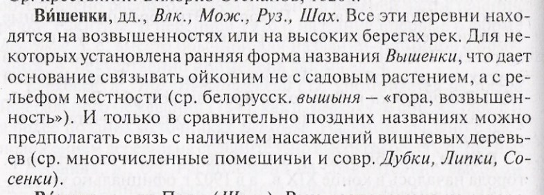 Все эти деревни ВИШЕНКИ (в Волоколамском, Можайском, Рузском и Шаховском районах) находятся на возвышенностях или на высоких берегах рек. Для некоторых установлена ранняя форма названия ВЫШЕНКИ, что дает основание связывать ойконим не с садовым растением, а с рельефом местности (ср. белорусское вышиня – гора, возвышенность). И только в сравнительно поздних названиях можно предполагать связь с наличием насаждений вишневых деревьев (многочисленные помещичьи и совр. Дубки, ЛИПКИ, СОСЕНКИ)