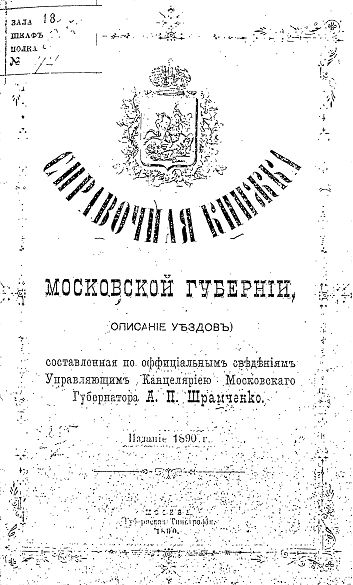 Справочное издание по уездам Московской губернии, составлено по официальным сведениям Управляющим Канцелярией Московского Губернатора А.П.Шрамченко. По всем уездам, в том числе и по Рузскому и Можайскому, помещены: историко-географическое описание местности с точным указанием количества жителей; сведения об уездных учреждениях и должностных лицах (управы, суды, конторы, врачи, ветеринары, аптеки, училища, школы и др.); о занятиях населения, о фабриках и заводах с обозначением вырабатываемых изделий; информация по усадьбам (дано название селения, фамилия владельца усадьбы); имеются таблицы расстояний каждого селения от уездного города, становых квартир, волостных правлений и квартир урядников.